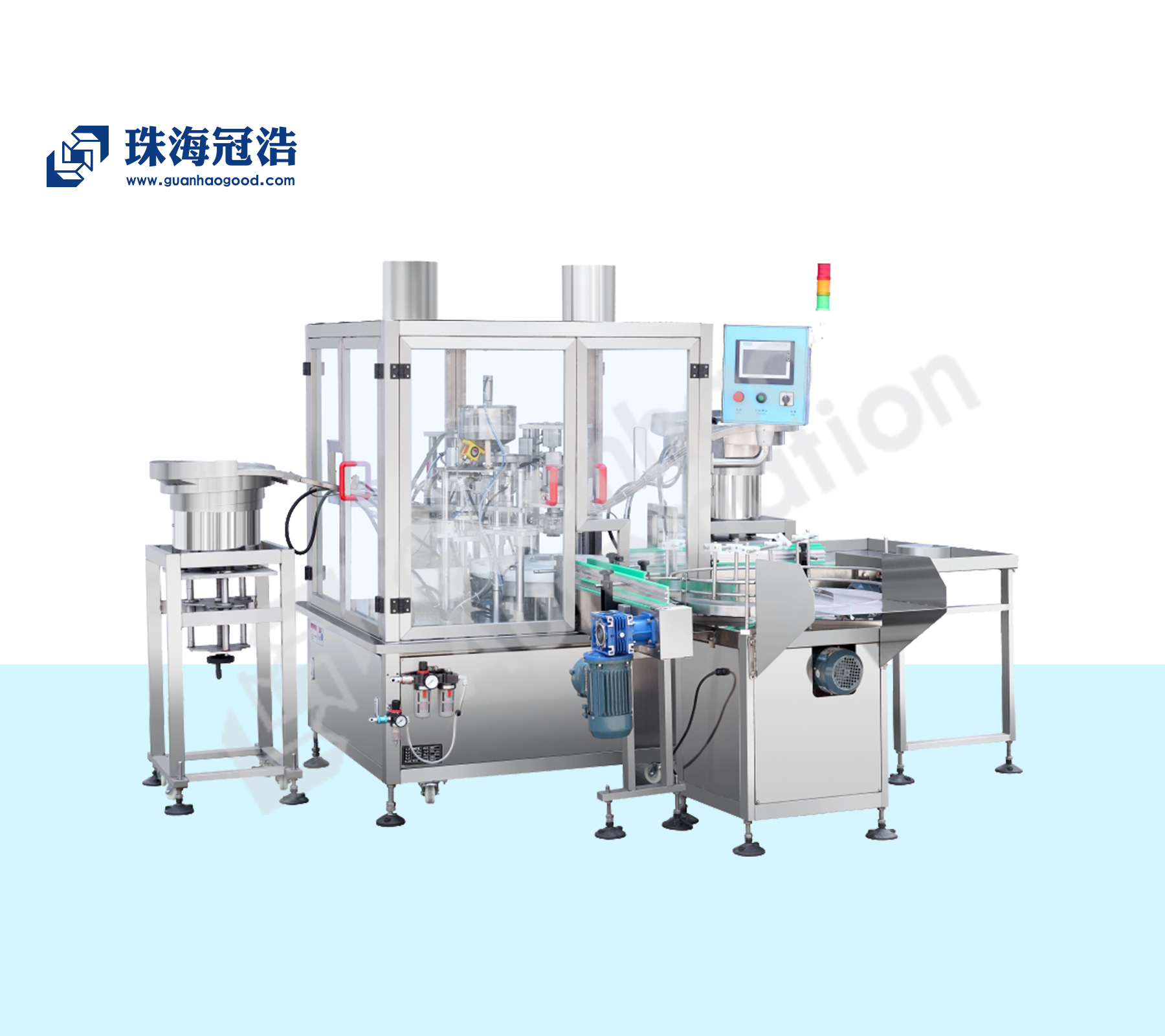 珠海冠浩機械客戶訂做機械系列-番茄醬生產(chǎn)線,主要由10頭灌裝機、直線式旋蓋機、立式圓瓶貼標機、送瓶轉(zhuǎn)盤組成。進口PLC程序控制,灌裝嘴及料槽材料等接觸液體部位均為304不繡鋼,密封圈采用聚四氟乙烯。